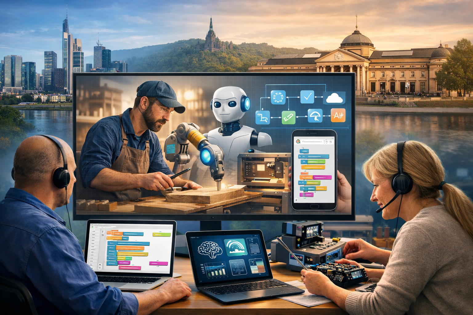 In unserem gemeinsamen Webinar der Handwerkskammern Frankfurt-Rhein-Main, Kassel und Wiesbaden zeigen wir praxisnahe KI-Automatisierungen für kleine und mittlere Handwerksbetriebe: Welche Quick Wins heute wirklich funktionieren, wo die Grenzen liegen und wie Betriebe mit begleitender Unterstützung über Low-/No-Code und „Vibe Coding“ einfache, eigene Tools entwickeln können.